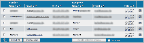 You can sort the log by clicking on the arrow icons next to each heading, and you can delete single or multiple log entries (deleting the log entries will not disable the ecard recipient to view the ecard).